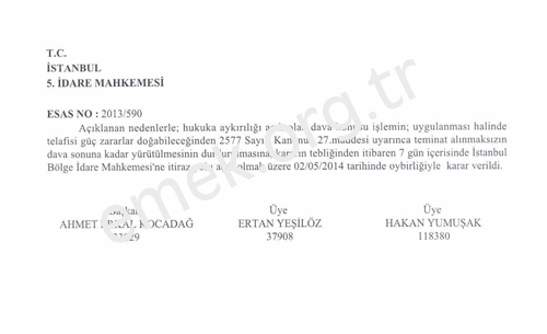 Bilirkişi heyetinin sunduğu raporu yeterli bulan İstanbul 5. İdare Mahkemesi dava sonuçlanana kadar yürütmenin durdurulması yönünde karar verdi.