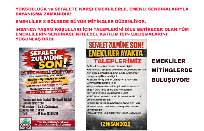 YOKSUL EMEKLİLER VE YAŞLILAR, KENDİLERİNE DAYATILAN SEFALETE KARŞI MEYDANLARA ÇIKIYOR. KÖTÜ YAŞAM KOŞULLARININ DEĞİŞMESİNİ İSTEYENLER TÜRKİYE GENELİNİ KAPSAYAN 8 ŞEHİRDE MİTİNG YAPIYOR.