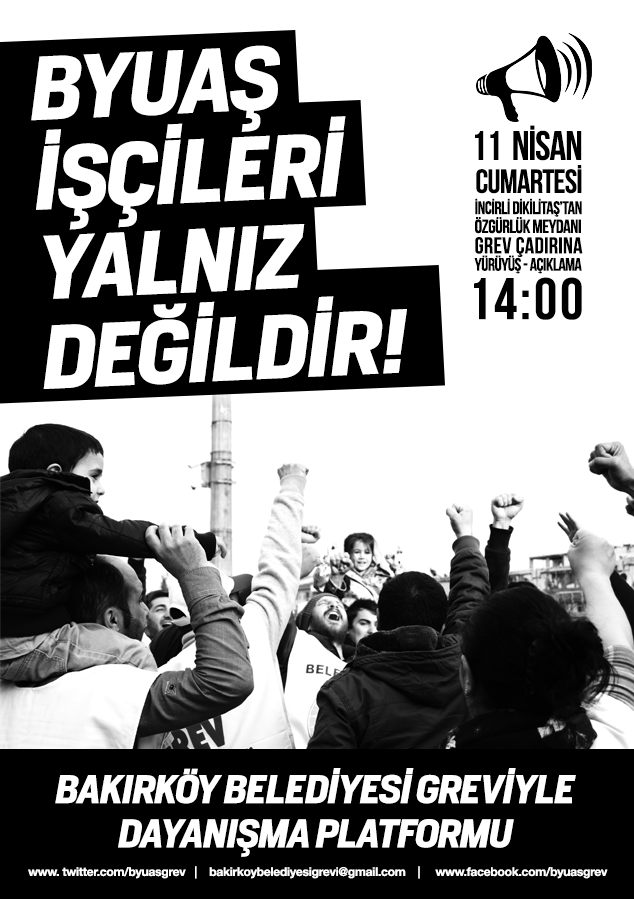 Bakırköy Belediyesi’ne bağlı BYUAŞ’ta grev devam ediyor. İşçiler Bakırköy Özgürlük Meydanı’nda çadırda direnişi sürdürürken, diğer taraftan demokratik kitle örgütleri de greve omuz vermek amacıyla “BAKIRKÖY BELEDİYESİ GREVİYLE DAYANIŞMA PLATFORMUNU” kurmuş durumda. Bugün İstanbul Bakırköy’de afişleme yapan Platform bileşenleri 11 Nisan Cumartesi saat 14.00’de İncirli Dikilitaş’tan Özgürlük Meydanı’na bir yürüyüş gerçekleştirecek. Emek.org.tr