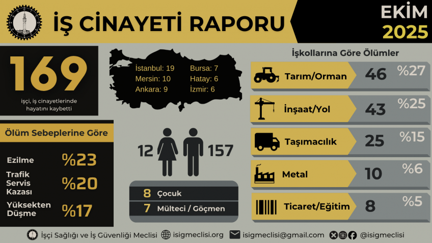 İSİG Meclisi 2025 Ekim ayı iş cinayetleri raporunu açıkladı. Ekim ayında da 169 işçi yaşamını yitirdi.
